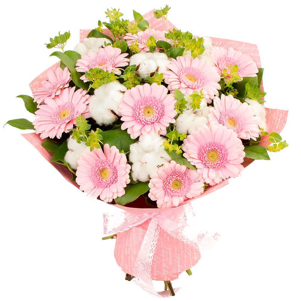 Гербера розовая, хлопок, экзотическая зелень. Упаковка (лента, пленка, крафт, сетка, пленка матовая)