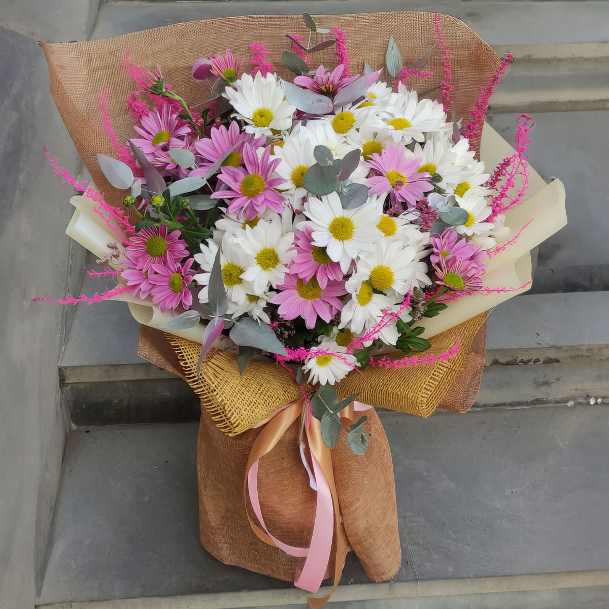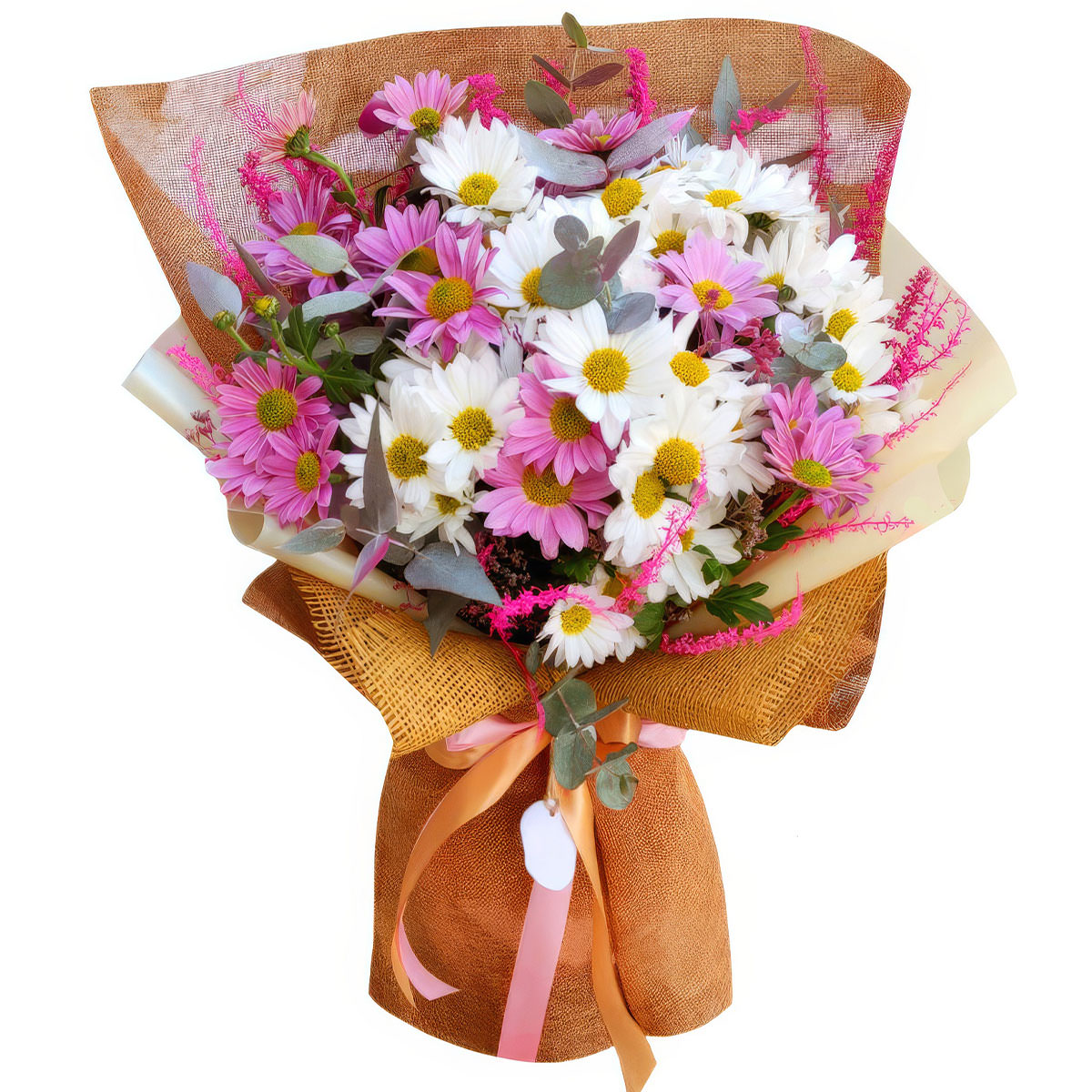Хризантема кустовая белая и розовая, эвкалипт, сухоцвет. Упаковка (лента, пленка, крафт, сетка, пленка матовая)