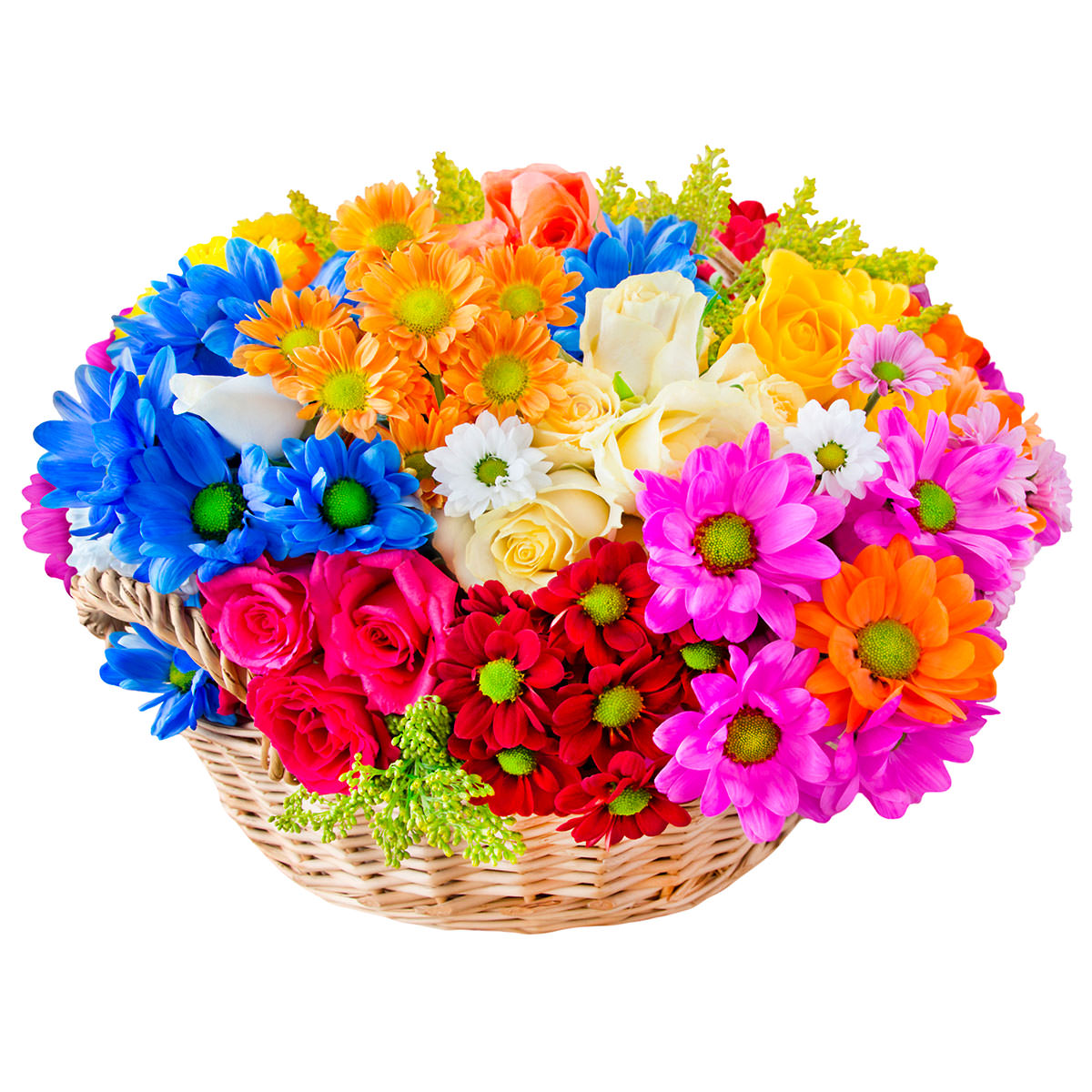 Хризантема разных цветов, роза одноголовая разных цветов, солидаго. Упаковка (Корзина, оазис, ящик).