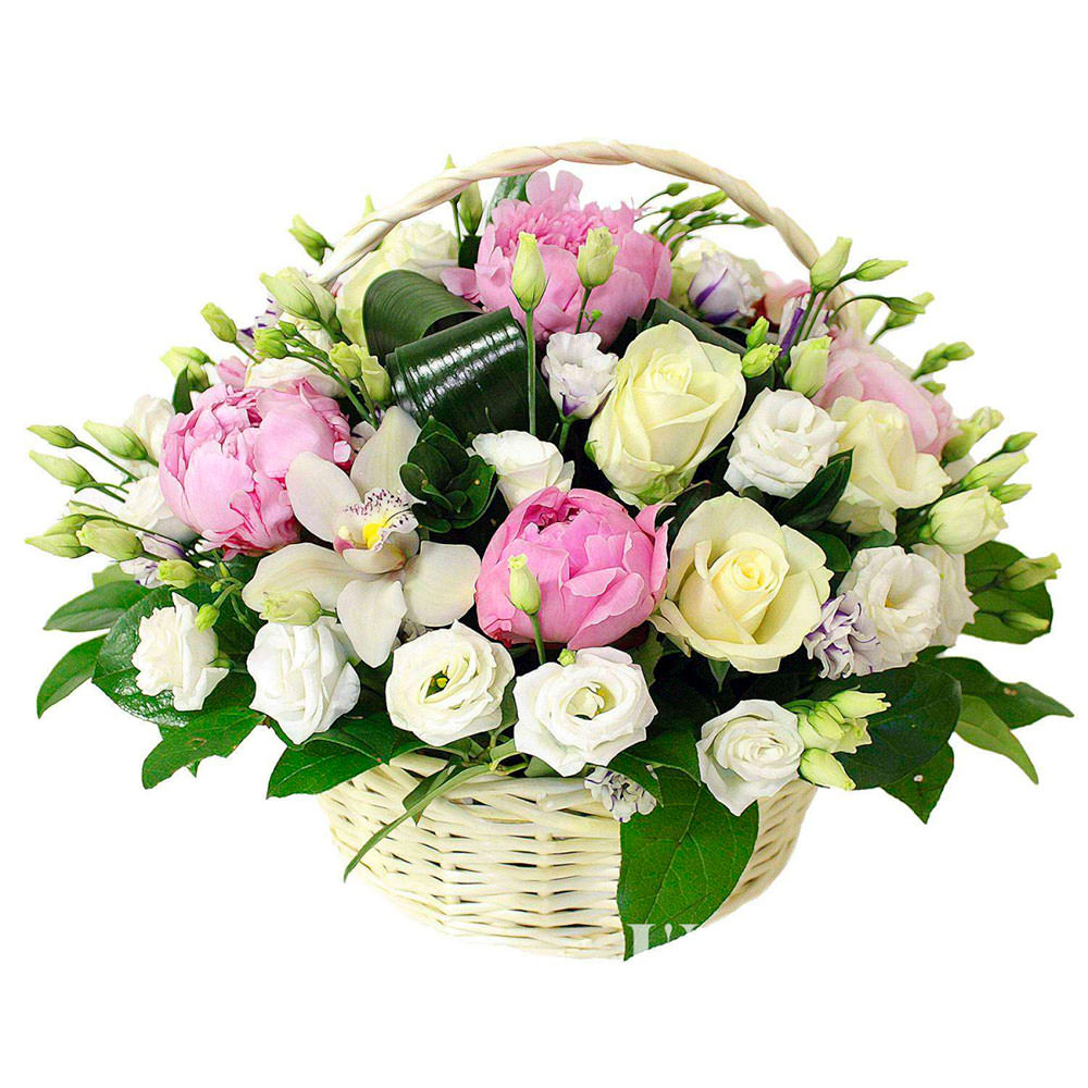 Пион розовый, роза кремовая, эустома белая, орхидея кремовая, аспидистра. Упаковка (Корзина, оазис).